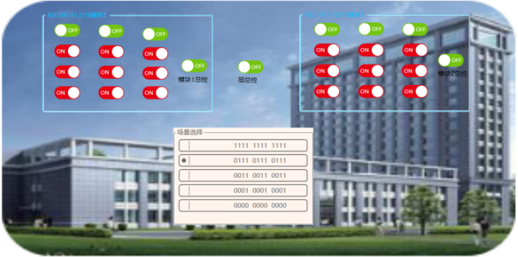 可以通过电脑或者触控终端控制一栋楼、某一层或某个区域所有照明灯具开关。可以对单个照明回路实现开关控制,还可对每个模块、箱子、楼层、自定义分区实现总控。现场受控回路的开关状态会实时反馈。