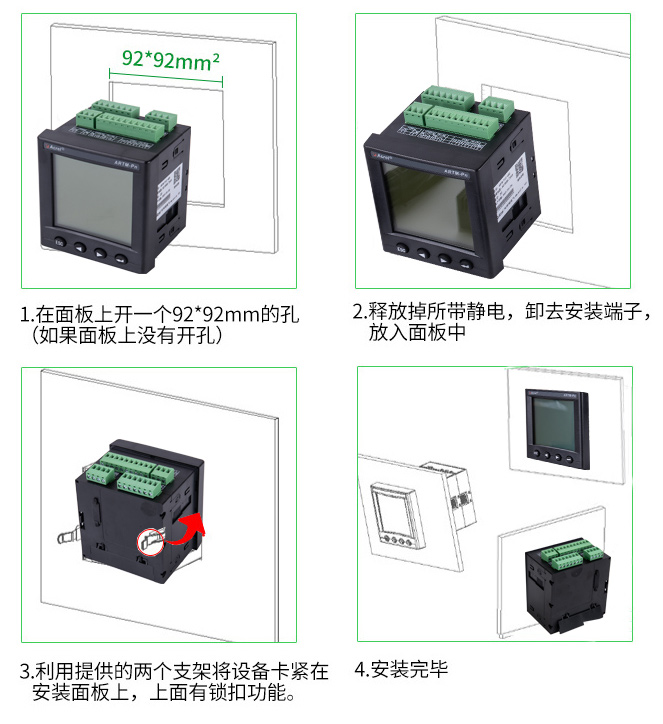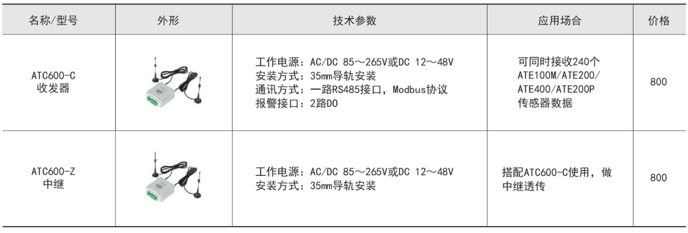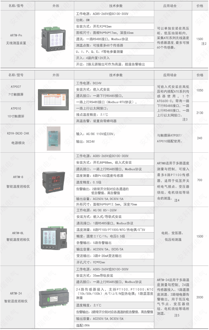 ARTM-Pn无线测温装置:ARTM-Pn无线测温装置可以单独安装在高压柜、低压抽屉柜内,每台装置可以接收18个传感器的数据,传感器型号可选配ATE100、ATE200、ATE300。装置带有一路485接口,可将采集到的温度数据上传到监控中心。