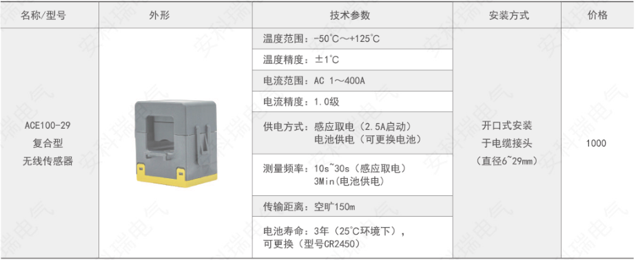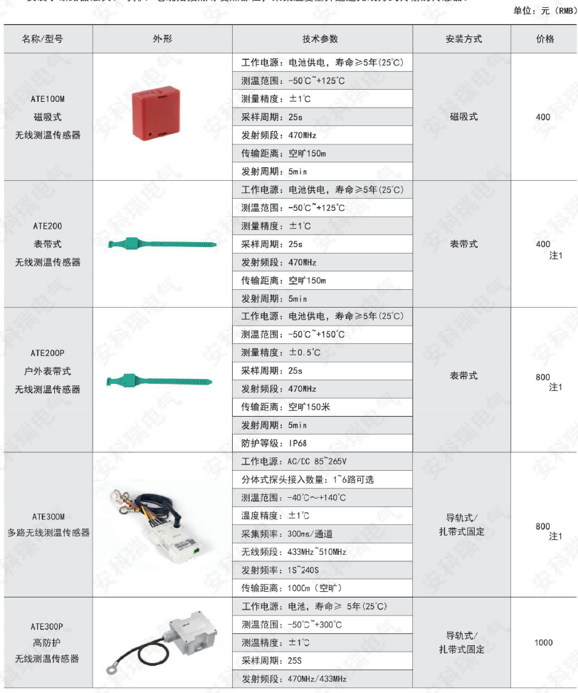 综上所述,确定型号为:无线测温装置:ARTM-P9-300,1台;无线测温传感器:ATE300,9个
