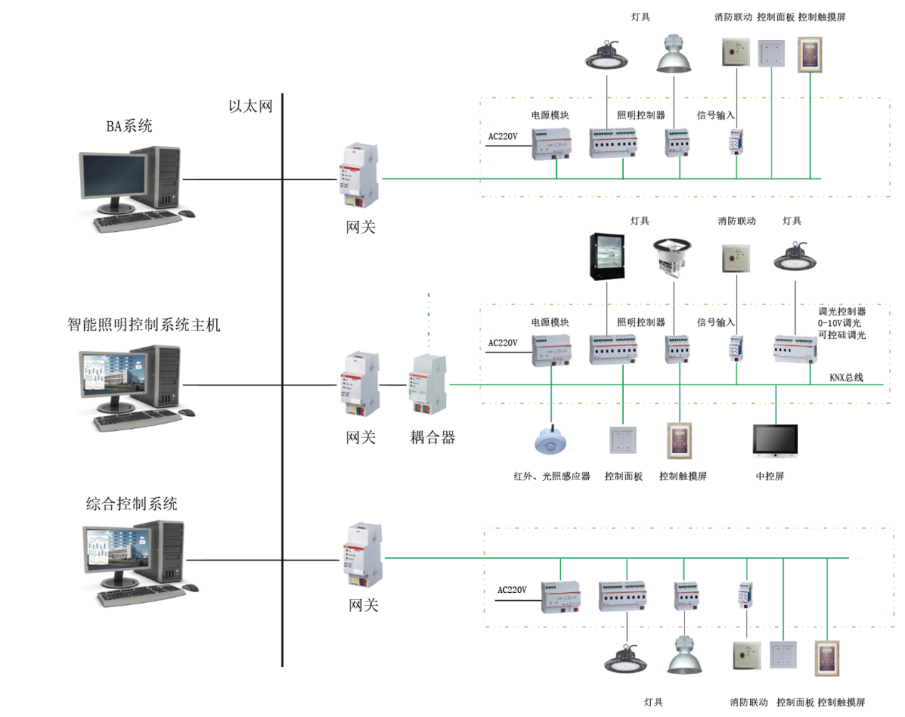 安装在控制现场的模块主要有光照度传感器、红外传感器和智能面板。有人经过可以设定红外感应控制亮灯,人离开后在设定的时间内熄灯,智能面板等手动控制设备,可实现自动控制、现场控制和值班室远程控制相结合。