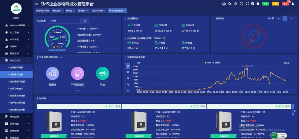 采用EMS能源管理解决方案,采集电表和逆变器的电压电流功率电能等数据,形成电能一次系统图,实现用电的智能化管理。在每一个配电间还加装有烟感、水浸、门磁等来监测配电间整体环境状态保证用电的安全性。在配电环节加装有我们公司的电能质量和滤波装置更好的保证了用电的可靠性。
