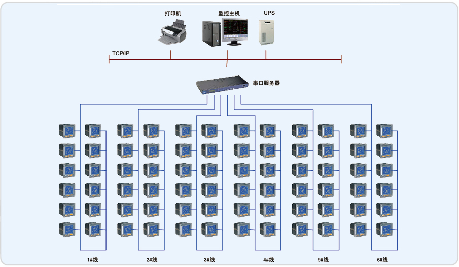 博欧木特种纸业有限公司三期电力监控系统针对淄博欧木特种纸业有限公司内三期低压配电室开关柜内安装的安科瑞智能电力仪表,现场约120只仪表,监控室位于配电室内。为满足配电室统一监控的要求,配电室现场安装安科瑞公司网络电力仪表通过屏蔽双绞线手拉手相连至串口服务器,串口服务器通过五类线接入后台主机,进行数据传输。
