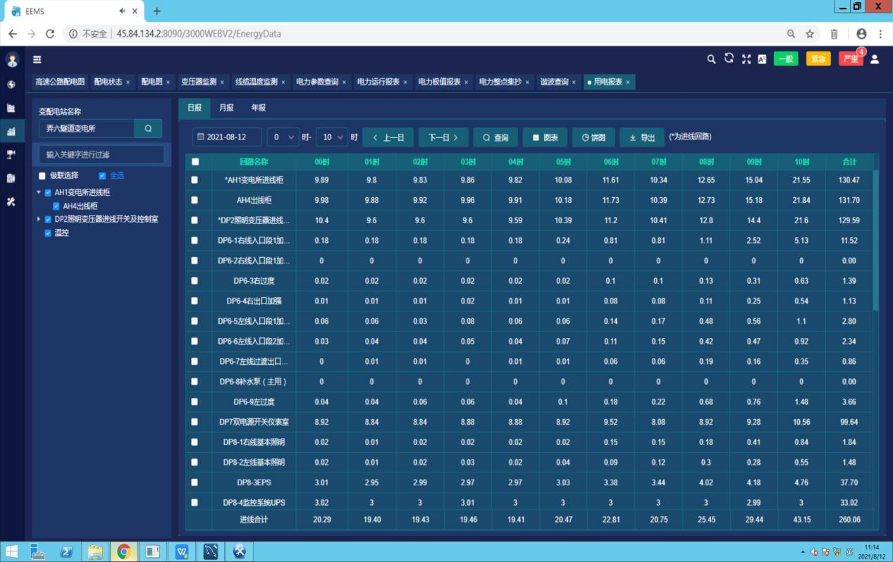查询各回路或设备指定时间的运行参数,报表中显示电参量信息应包括:各相电流、三相电压、总功率因数、总有功功率、总无功功率、正向有功电能等.
