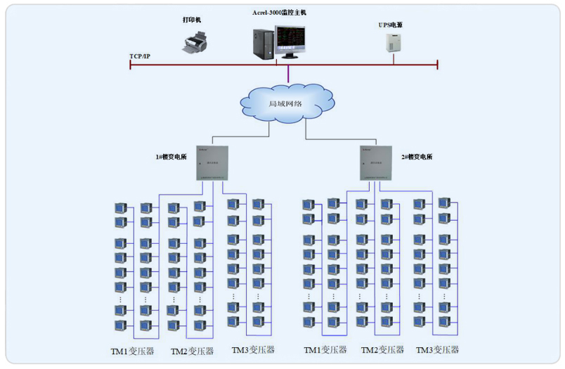 本项目共有176个PZ80L-E4/KC、14个PZ96L-E4/KC多功能电力仪表。值班室位于1#楼配电室旁,放置一台Nport5630-16串口服务器。场仪表经485总线连接值串口服务器的任务,串口服务器由现场的以太网络将数据传输至监控主机上。本监控系统采用分层分布式结构,即站控层,通讯层与间隔层。