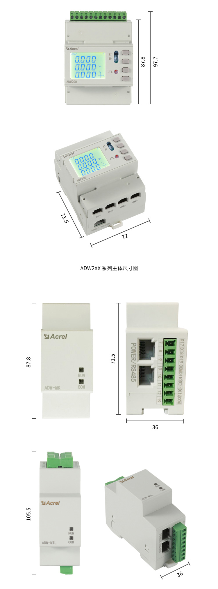 ADW2xx系列导轨式多回路电力仪表主要用于低压三相回路全电参量测量,同时可选择四个回路的电流输入。可直接或间接测量电压、电流、功率、功率因数、相角、不平衡度、谐波等参数。 还可通过其RJ45接口扩展辅助功能,实现DI、DO、测温、剩余电流测量,以及2G、4G、LoRa、LoRaWan、NB-Lot无线通信功能。
