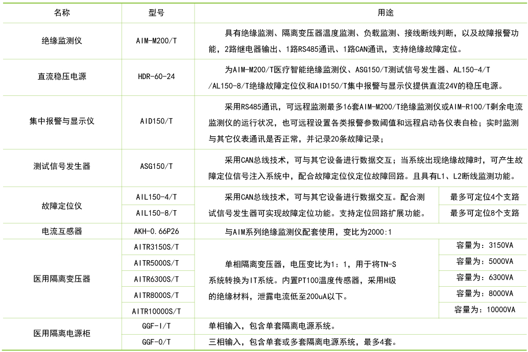 适用于医院的手术室、各类重症监护室、抢救室、血透中心、内窥镜室及造影室等医疗2类场所的医用隔离电源系统的远程监控及自动化管理。