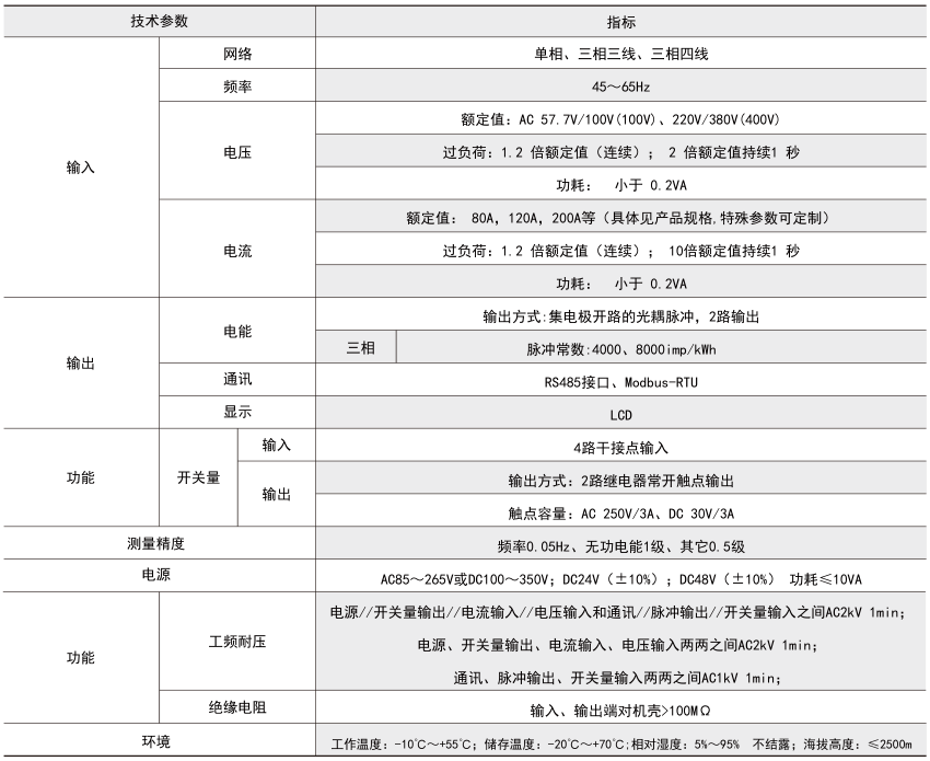 它集成全部电力参数的测量(如单相或者三相的电流、电压、有功功率、无功功率、视在功率、频率、功率因数等)、复费率电能计量、四象限电能计量、谐波分析以及电能监测和考核管理。多种外围接口功能:带有RS485/MODBUS-RTU协议;带开关量输入和继电器输出可实现断路器开关的“遥信”和“遥控”的功能,采用LCD显示界面,通过面板按键来实现参数设置和控制,非常适合于实时电力监控系统。