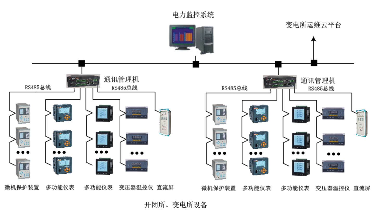 系统采用分布式结构,微机保护装置、多功能仪表、变压器温控器、直流屏、柴油发电机控制屏等设备通过RS485总线或者以太网接入智能网关,经过协议转换、数据处理后上传至电力监控系统,实现遥测、遥信、遥控、异常报警等功能。