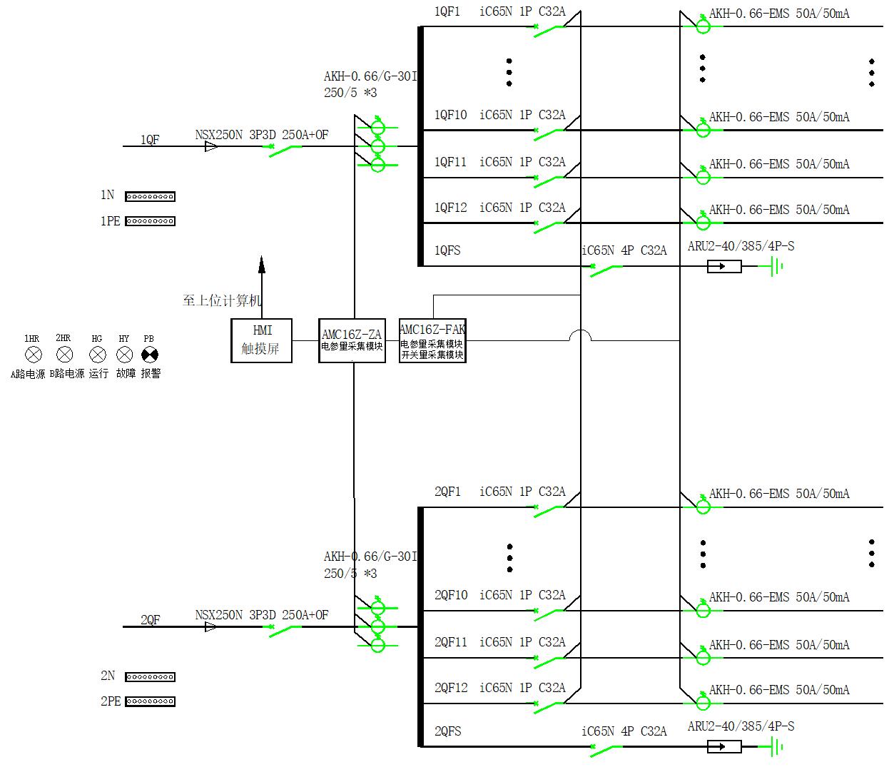 安科瑞交流精密配电监控装置系列是专门针对于数据中心服务器电源管理设计的测量装置。该装置设计小巧,能够对 A+B 两路进线和 96或192路出线的全电参量参数、输入输出开关及防雷器状态等实时监测, 所有测量通道的告警阈值均可单独设定,出线越限事件立即触发系统声光告警,在传统仪表的体积上实现了监控回路的高度集成。如典型配电图。