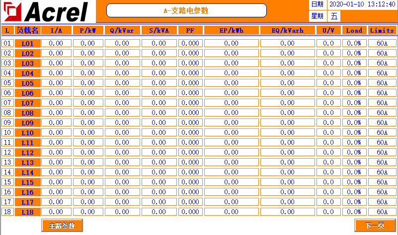 触摸屏开启后的第一个界面为主路参数界面,如果有多路进线,可点击右下角的按钮切换查看其它进线的参数。