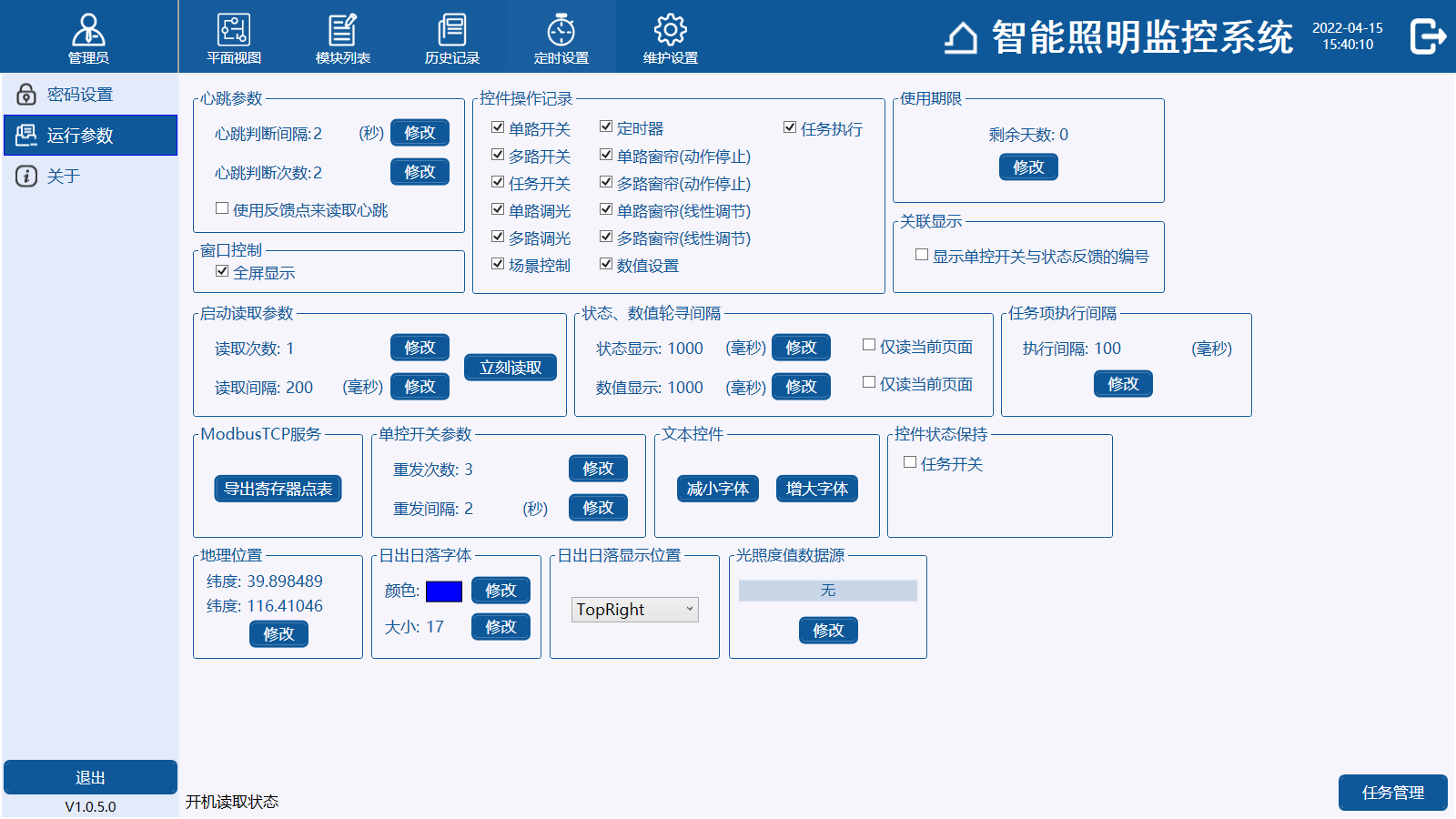 9)系统可以通过预设的当地经纬度信息,自动计算每天的日升日落时间;根据天文时钟控制照明开关,实现日落开灯、日出关灯的功能。